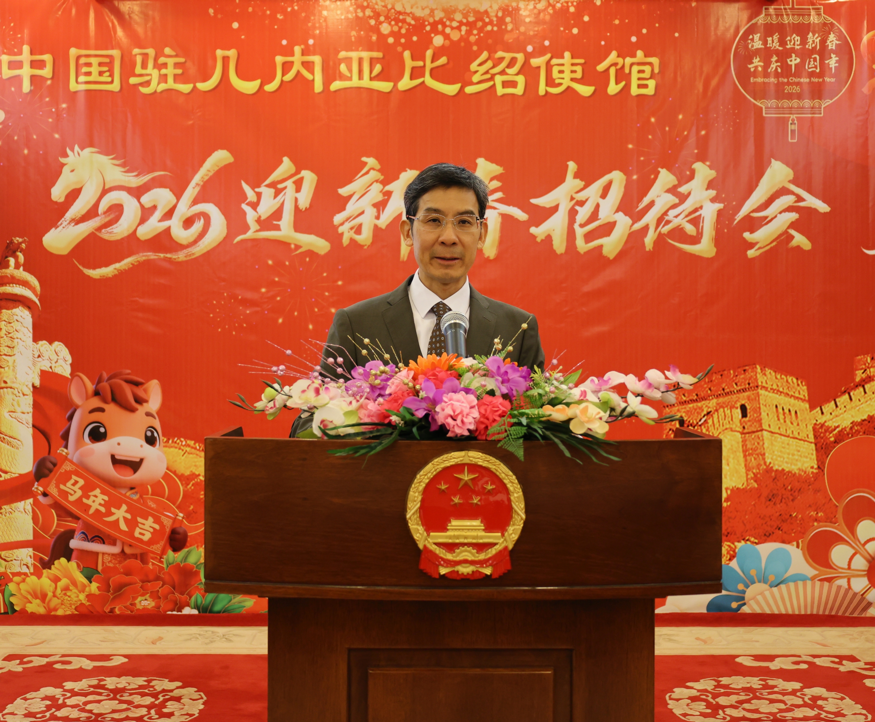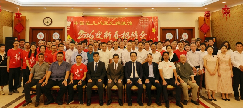 2026年1月18日,驻几内亚比绍使馆举办“温暖迎春·共庆中国年”春节招待会,杨仁火大使出席并致辞。在几比中资机构企业、华侨代表等共百余人参加。