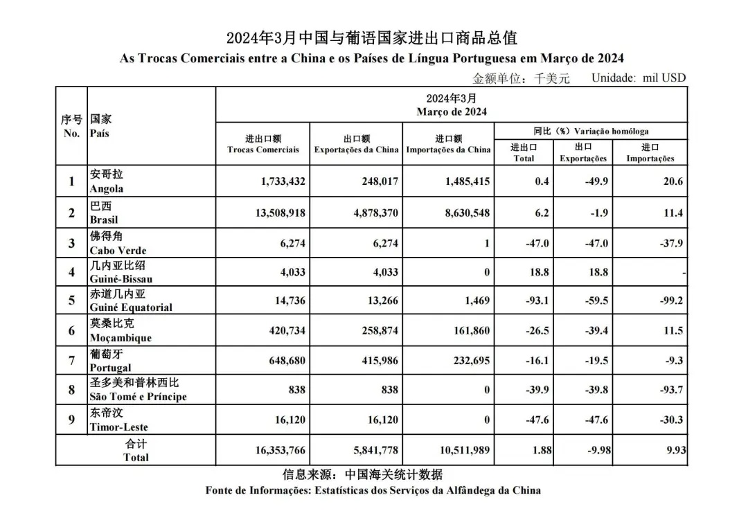 据中国海关数据显示,2024年3月,中国与葡语国家进出口总额163.54亿美元,同比增长1.88%,其中中国自葡语国家进口105.12亿美元,同比增长9.93%;对葡语国家出口58.42亿美元,同比下降9.98%。