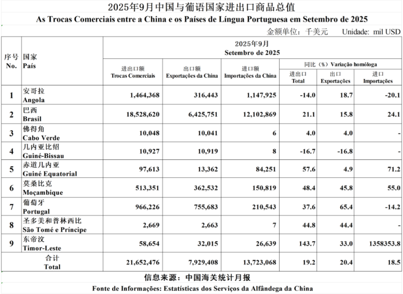 2025年9月,中国与葡语国家进出口总额216.52亿美元,同比增长19.21%,其中中国自葡语国家进口137.23亿美元,同比增长18.52%;对葡语国家出口79.29亿美元,同比增长20.43%。