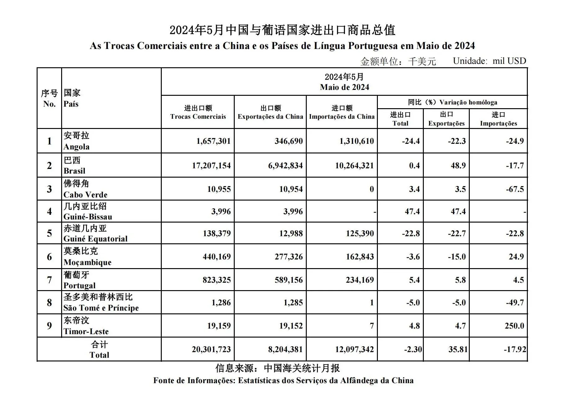 据中国海关数据(详见附表)显示,2024年5月,中国与葡语国家进出口总额203.01亿美元,同比下降2.30%,其中中国自葡语国家进口120.97亿美元,同比下降17.92%;对葡语国家出口82.04亿美元,同比增长35.81%。